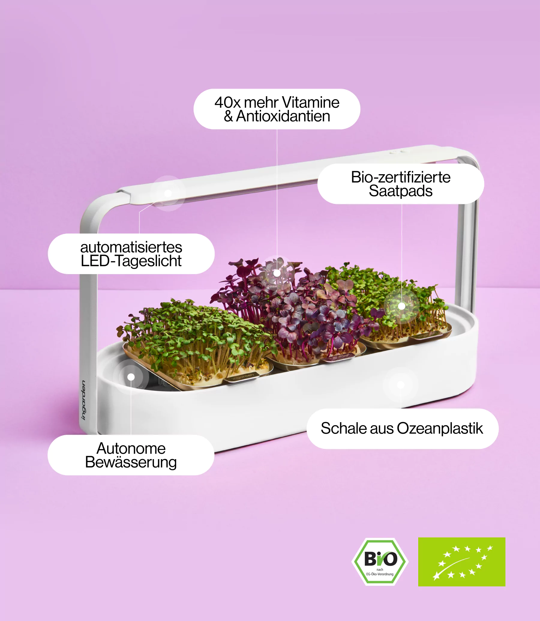 Ingarden voegt belangrijke voedingsstoffen toe aan uw maaltijd door middel van minigroenten die u automatisch binnen slechts 7 dagen kweekt. Tot 40 keer meer dan volgroeide groenten.