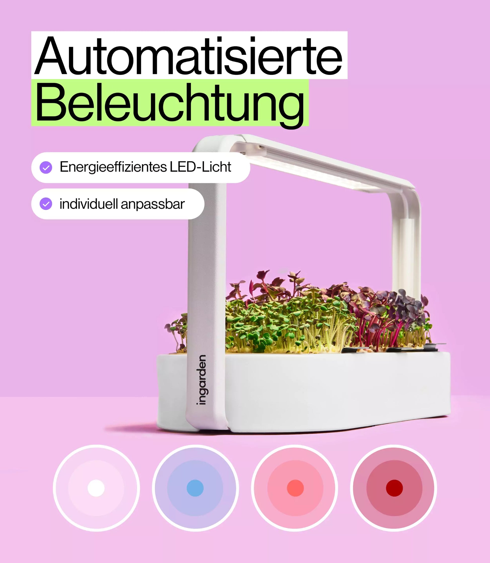 ingarden is uitgerust met een energiezuinig LED-groeilicht om een optimale groei van microgroenten te garanderen met een zo laag mogelijk energieverbruik. De LED kweeklamp is 13,5 watt en verbruikt 0,162 kWh in 12 uur, dus 1,1 kWh in 7 dagen tot aan de oogst. Volgens informatie van de Federal Association of Energy and Water Industries (BDEW) kost elektriciteit momenteel 36,19 cent/kWh (vanaf januari 2022). Dit betekent dat het produceren van een ingarden 39,8 cent kost.