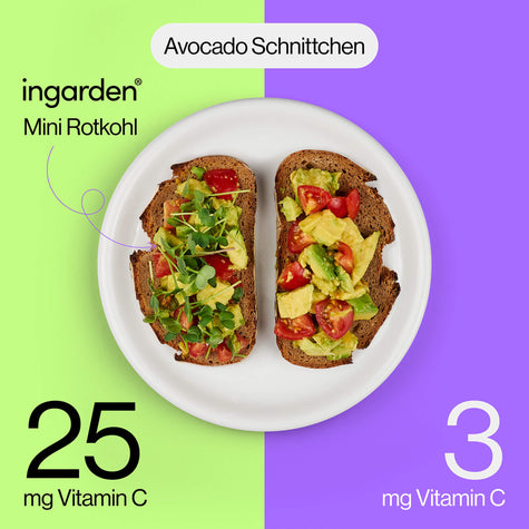 Vergeleken met 100 gram rauwe rode kool uit de supermarkt* bevat 100 gram biologische rode koolmicrogroenten uit de moestuin: