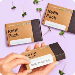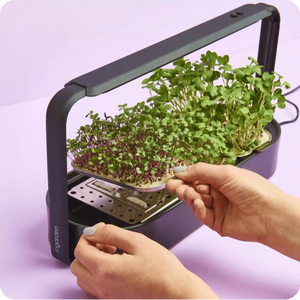 man with grey hair cutting microgreens in his ingarden growing kit little girl looking fascinated at her ingarden microgreens