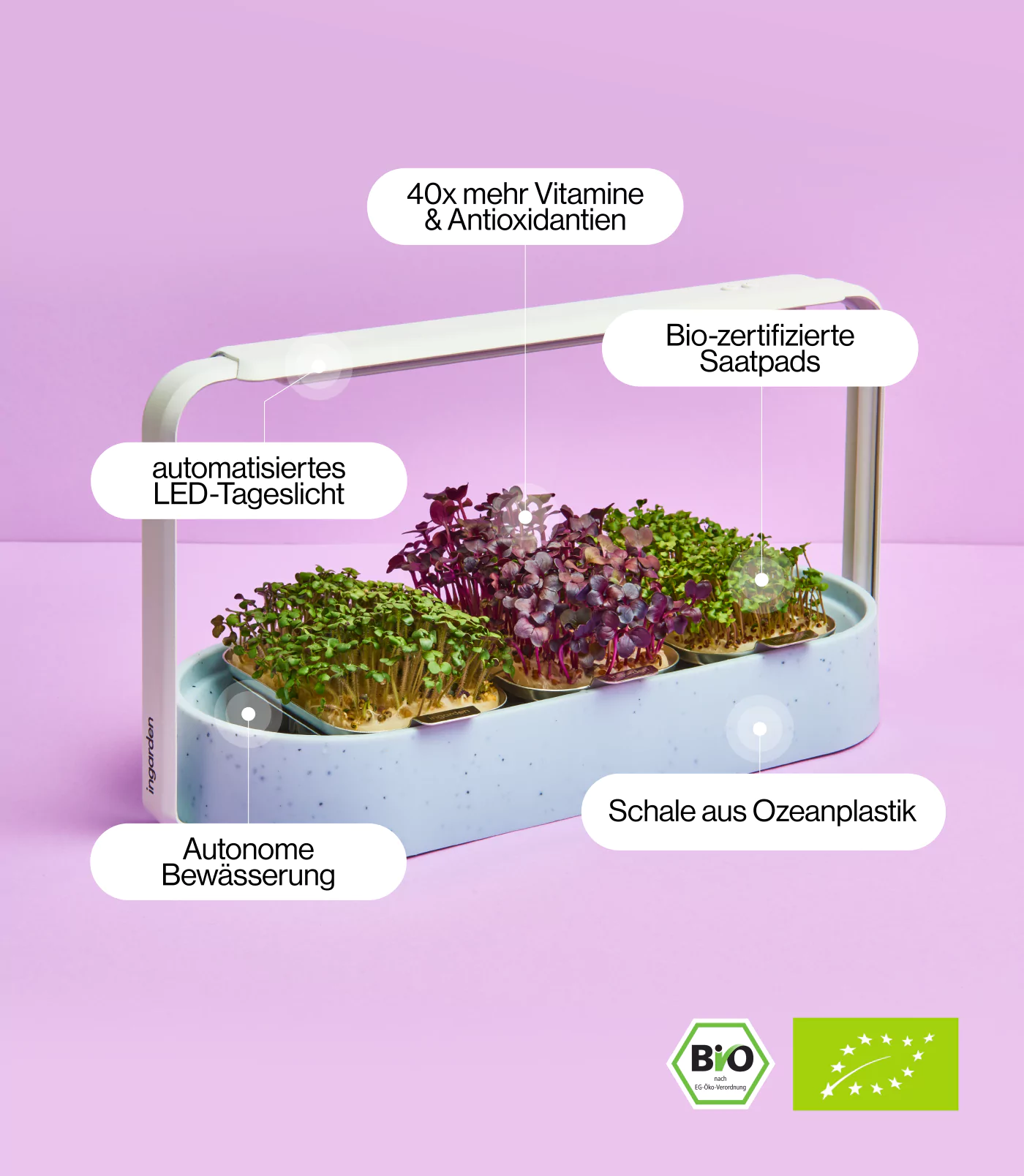 Zieh dir Bio-Microgreens mit bis zu 40x mehr Nährstoffen als herkömmliches Gemüse – im designprämierten Smart Garden. Das Set enthält alles, was du zum Wachsen brauchst.