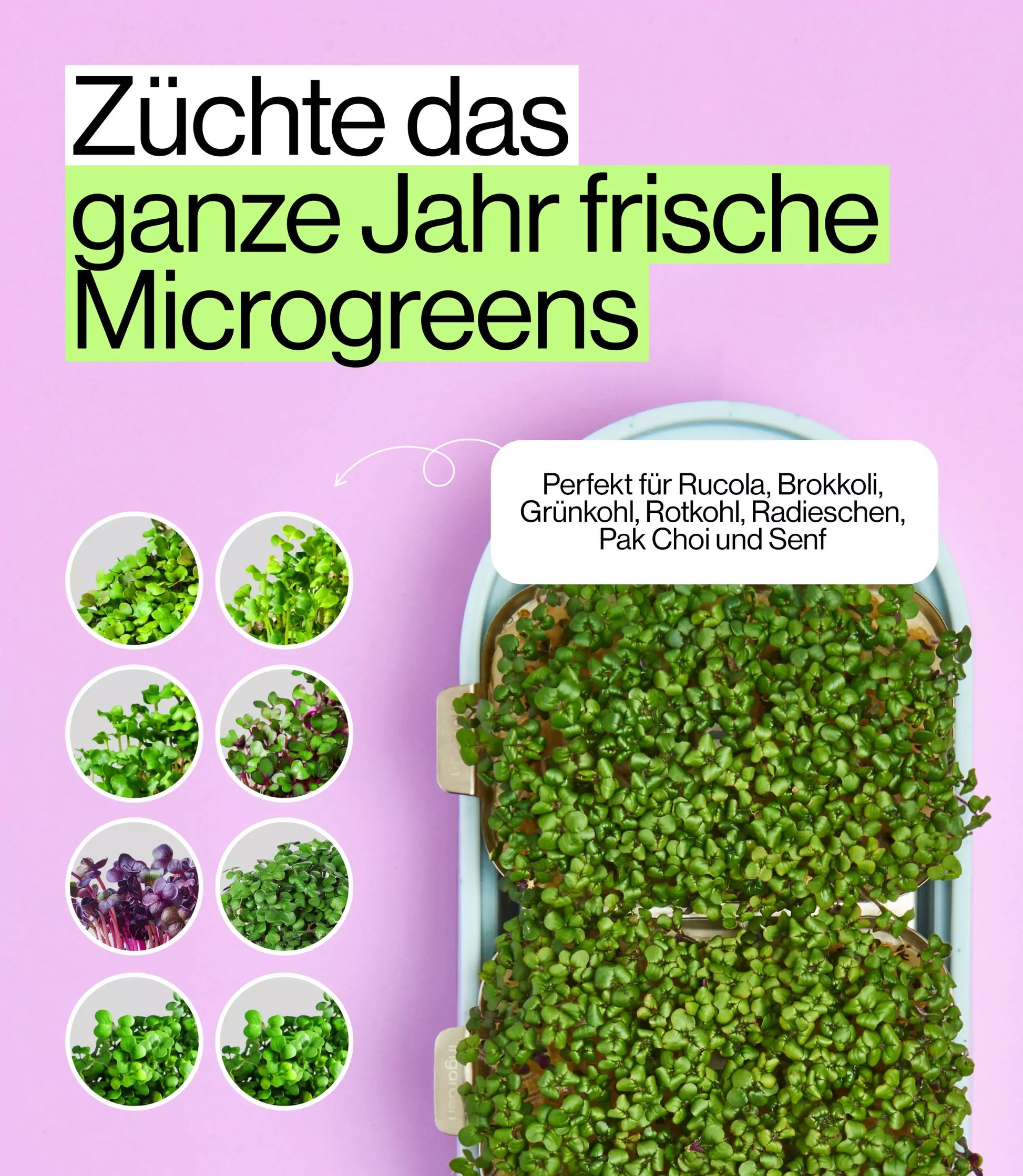 - Auswahl von Microgreens, die bis zu 40 Mal mehr Nährstoffe haben im Vergleich zu den großen Verwandten