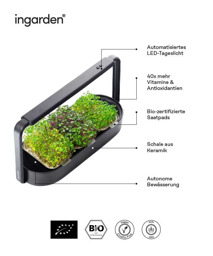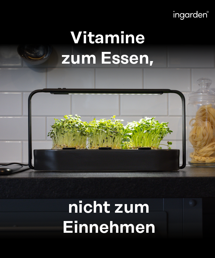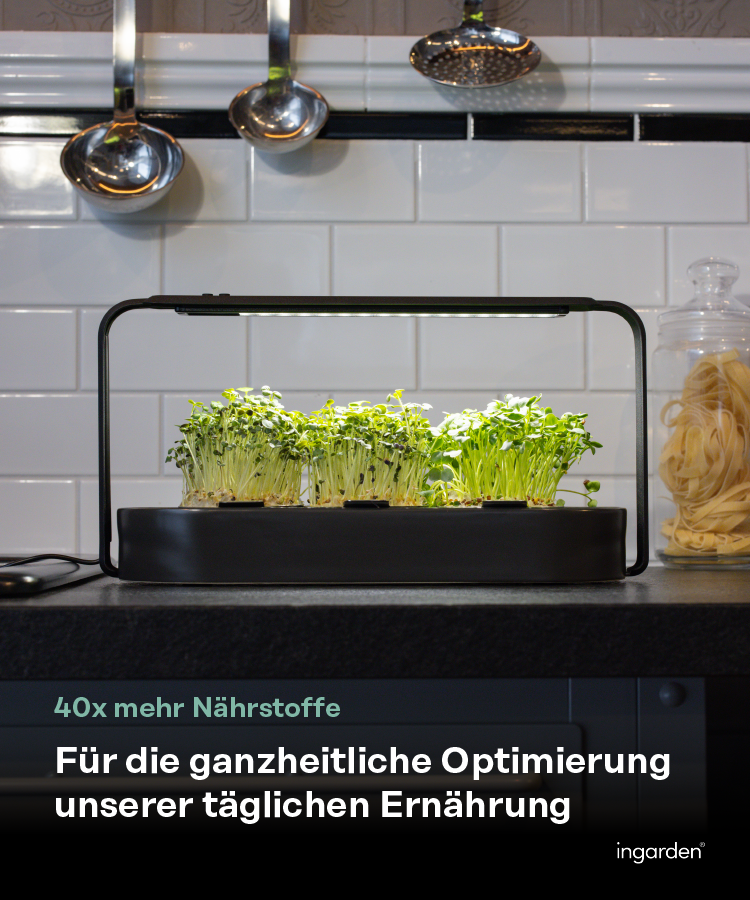 ingarden fügt über Mini-Gemüse, das du innerhalb von nur 7 Tagen automatisiert anbaust, wichtige Nährstoffe zu deinem Essen hinzu. Bis zu 40 Mal mehr als ausgereiftes Gemüse.