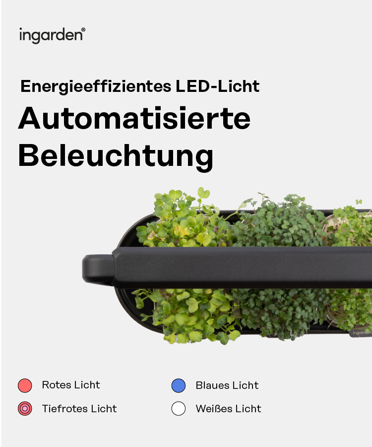 ingarden ist ausgestattet mit einem energieeffizienten LED-Wachstumslicht, um das optimale Wachstum für Microgreens zu gewährleisten, bei so geringem Stromverbrauch wie möglich. Das LED-Wachstumslicht hat 13,5 Watt und verbraucht 0,162 kWh in 12 Stunden, also 1,1 kWh in 7 Tagen bis zur Ernte. Gemäß Angaben des Bundesverbands der Energie- und Wasserwirtschaft (BDEW), kostet der Strom aktuell 36,19 Cent/kWh (Stand Januar 2022). Daraus ergibt sich, dass die Produktion einer ingarden-Ernte 39,8 Cent kostet.