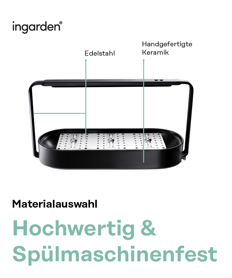 Wenn du deinen ingarden einmal im Monat reinigst, kannst du sicher sein, dass die Qualität der Microgreens erhalten bleibt und keine unerwünschten Gerüche entstehen. Die Keramikschale sowie die Edelstahl-Pad-Schalen und Dochthalter sind spülmaschinenfest (max. 55 °C).