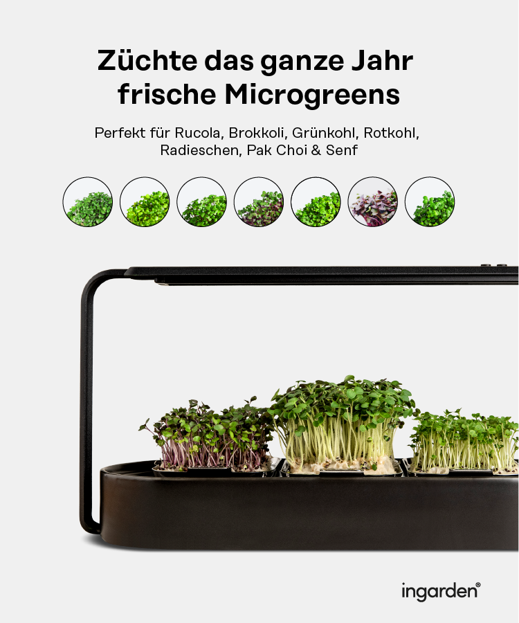 • Auswahl von Microgreens, die bis zu 40 Mal mehr Nährstoffe haben im Vergleich zu den großen Verwandten
