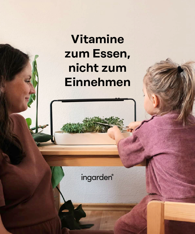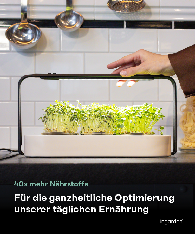 Deshalb haben wir das ingarden Set entwickelt – ein smartes System, das Design, Gesundheit und Einfachheit vereint. Es liefert dir täglich frisches Grün mit über 27 klinisch geprüften, bioaktiven Vitaminen und Mineralstoffen – direkt in dein Essen. Für mehr Fokus, Immunpower, Regeneration und strahlende Haut.