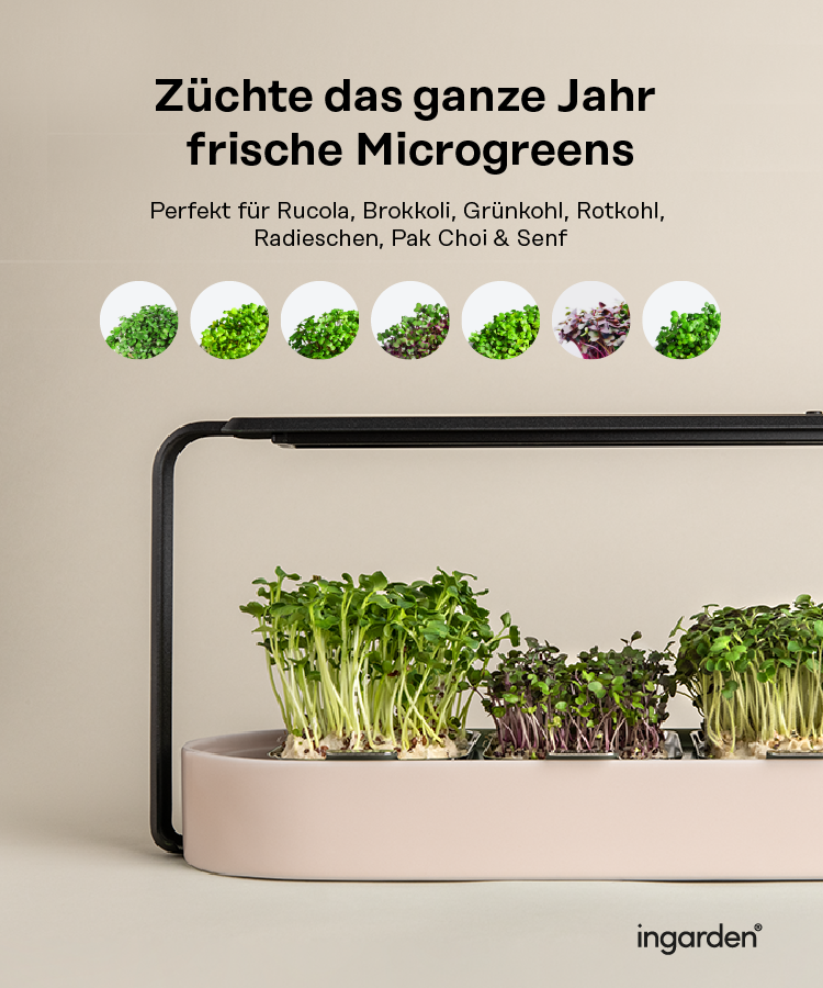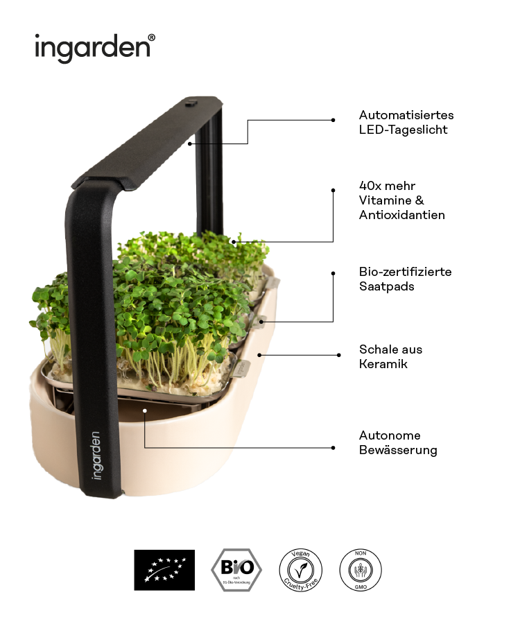ingarden fügt über Mini-Gemüse, das du innerhalb von nur 7 Tagen automatisiert anbaust, wichtige Nährstoffe zu deinem Essen hinzu. Bis zu 40 Mal mehr als ausgereiftes Gemüse.