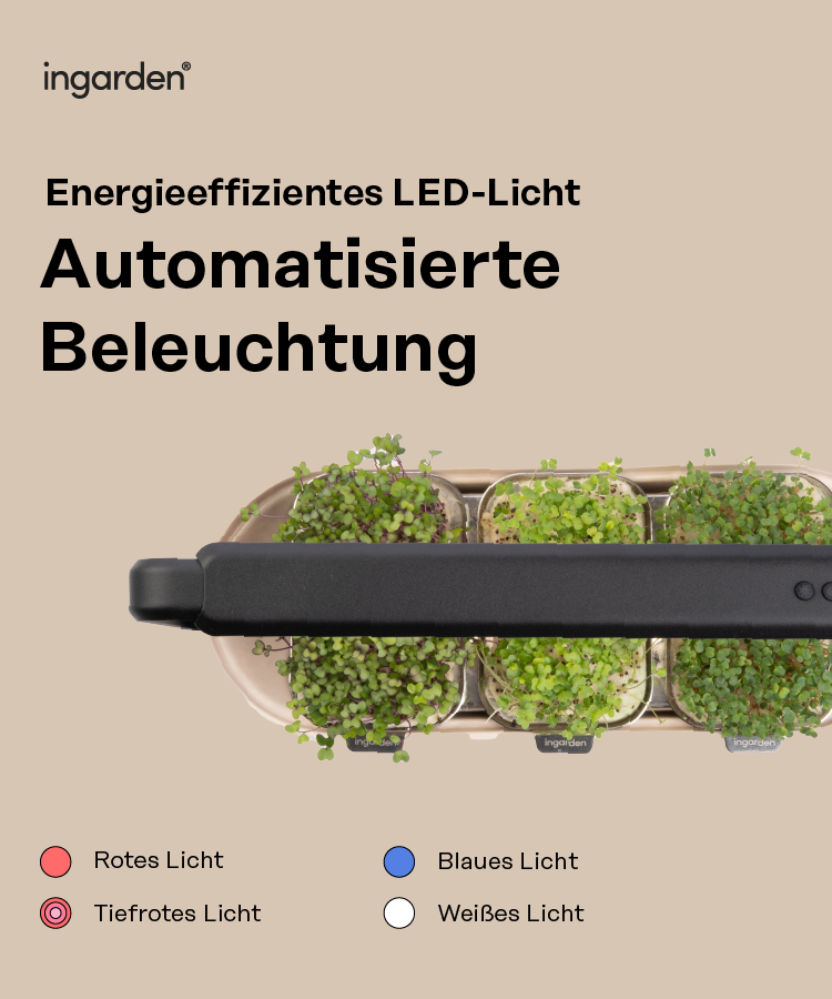 ingarden ist ausgestattet mit einem energieeffizienten LED-Wachstumslicht, um das optimale Wachstum für Microgreens zu gewährleisten, bei so geringem Stromverbrauch wie möglich. Das LED-Wachstumslicht hat 13,5 Watt und verbraucht 0,162 kWh in 12 Stunden, also 1,1 kWh in 7 Tagen bis zur Ernte. Gemäß Angaben des Bundesverbands der Energie- und Wasserwirtschaft (BDEW), kostet der Strom aktuell 36,19 Cent/kWh (Stand Januar 2022). Daraus ergibt sich, dass die Produktion einer ingarden-Ernte 39,8 Cent kostet.
