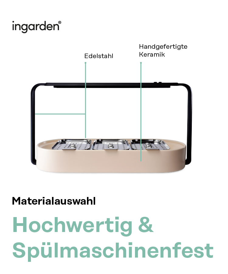 Wenn du deinen ingarden einmal im Monat reinigst, kannst du sicher sein, dass die Qualität der Microgreens erhalten bleibt und keine unerwünschten Gerüche entstehen. Die Keramikschale sowie die Edelstahl-Pad-Schalen und Dochthalter sind spülmaschinenfest (max. 55 °C).
