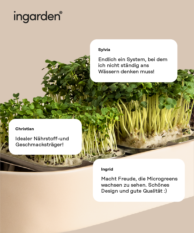Qualität, Stil und Funktionalität sind unsere höchsten Prioritäten bei ingarden. Deshalb bieten wir eine einzigartige Keimungsgarantie an: Sollten deine Samen innerhalb von 7 Tagen nicht keimen, erhältst du kostenlos Ersatz-Pads. Unser Versprechen für deine Zufriedenheit.
