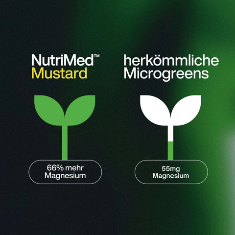 NutriMed™ Senf-Microgreens sind mit bis zu 66% mehr Magnesium angereichert als herkömmliche Senfkeimlinge. Dies wurde durch eine rein organische Vorbehandlung des Saatguts erreicht, die die Nährstoffkonzentration in den Keimlingen erhöht.